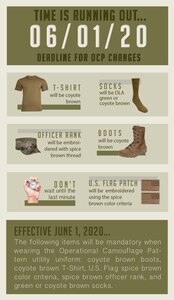 Effective June 1, 2020, the following items will be required when wearing the Operational Camouflage Pattern utility uniform: coyote brown boots, coyote brown T-shirt, U.S. Flag spice brown color criteria, spice brown officer rank, and green or coyote brown socks. As the deadline approaches, Airmen