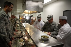 445th Airlift Wing commanders, chiefs and first sergeants serve lunch at the Pitsenbarger Dining Facility to 445th AW Airmen during the Nov. 4, 2018 unit training assembly. Each year, commanders, chiefs and first sergeants serve lunch and holiday meals to Airmen during the November and December unit