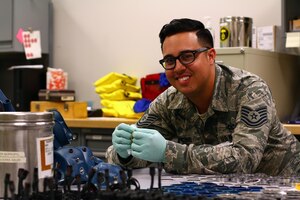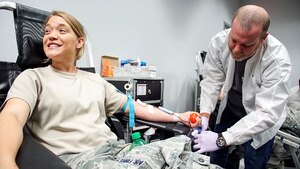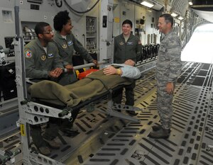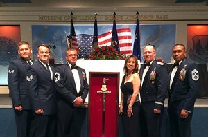 Senior Airman Robert Wince, 445th Aircraft Maintenance Squadron, Staff Sgt. Anthony Busellato, 87th Aerial Port Squadron, Senior Master Sgt. Frankie Lowder, 445th Security Forces Squadron and Chief Master Sgt. James Felton, 445th Airlift Wing Command Chief, share a moment with Lt. Gen. James F.