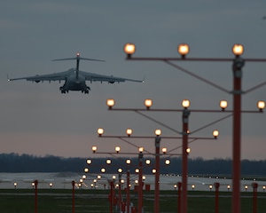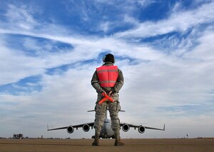 Senior Airman Cody Burdette, 445th Aircraft Maintenance Squadron aircraft mechanic, prepares to marshal a 445th Airlift Wing C-17 Globemaster III getting ready to leave its spot on the ramp for a local flight March 22, 2016. The clouds over the C-17 formed an “X” in the sky, matching the Airman’s