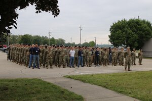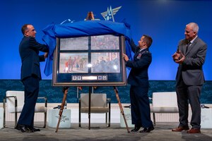 U.S. Air Force Tech. Sgt. Jacquelyn Chapin presents then-Senior Airman Daniel Schnaars, 87th Aerial Port Squadron, with the John L. Levitow award during the Airmen Leadership School Class 23-E graduation at Wright-Patterson Air Force Base, Ohio, June 29, 2023. The award is the highest honor