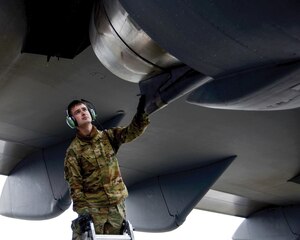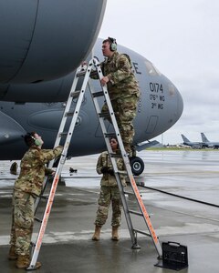 U.S. Air Force Staff Sgt. Nick Fannin, ladder, 445th Aircraft Maintenance Squadron aerospace propulsion technician, checks the intake of a C-17 Globemaster III aircraft engine as Tech. Sgt. Connor Karman, 445th AMXS aerospace propulsion technician, stabilizes the ladder at Joint Base