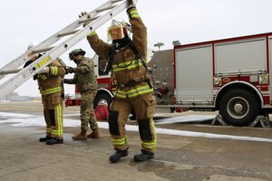 Col. Jennifer Mulder, 655th Intelligence, Surveillance and Reconnaissance Group commander, passes the guidon to incoming 71st Intelligence Squadron commander, Lt. Col. David Amar, during a change of command ceremony Feb. 12, 2022. Lt. Col. Heidi Nelson relinquished command of the squadron to Amar.