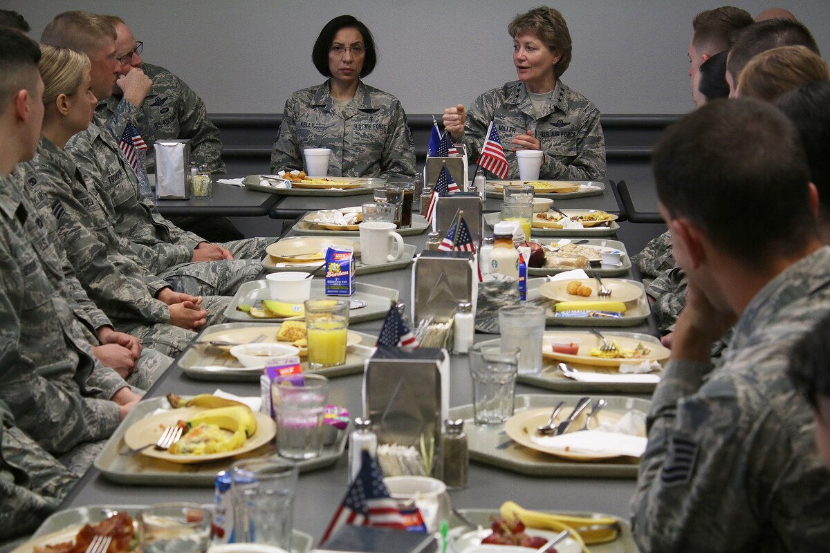 Lt. Gen. Maryanne Miller, Air Force Reserve Command commander and Chief of the Air Force Reserve, and Chief Master Sgt. Ericka Kelly, AFRC command chief, talk with 445th Airlift Wing Airmen during breakfast at the Pitsenbarger Dining Facility May 5, 2018. During their visit to the wing May 4-6, the general and chief had lunch with group and squadron commanders, chiefs and first sergeants; and toured various 445th AW units. The AFRC leaders also visited the 655th Intelligence, Surveillance and Reconnaissance Group and National Air and Space Intelligence Center during their visit to Wright-Patterson Air Force Base. (U.S. Air Force photo/Master Sgt. Patrick O’Reilly)