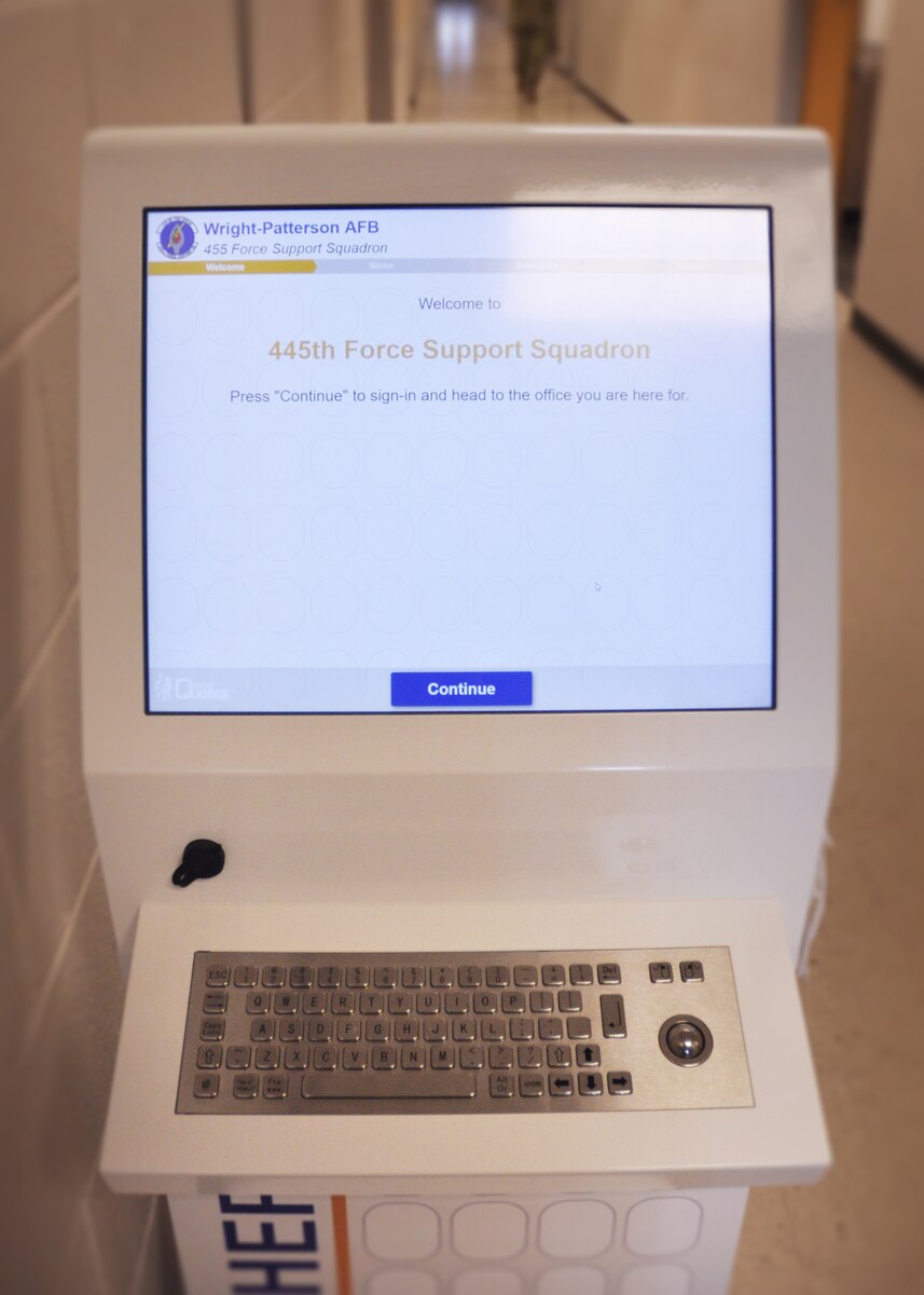 WRIGHT-PATTERSON AIR FORCE BASE, Ohio -- Customers seeking services from the 445th Force Support Squadron are greeted by a new, digital sign in system. Featuring a user-friendly interface, the kiosk adds customers to the queue for each office located within FSS.