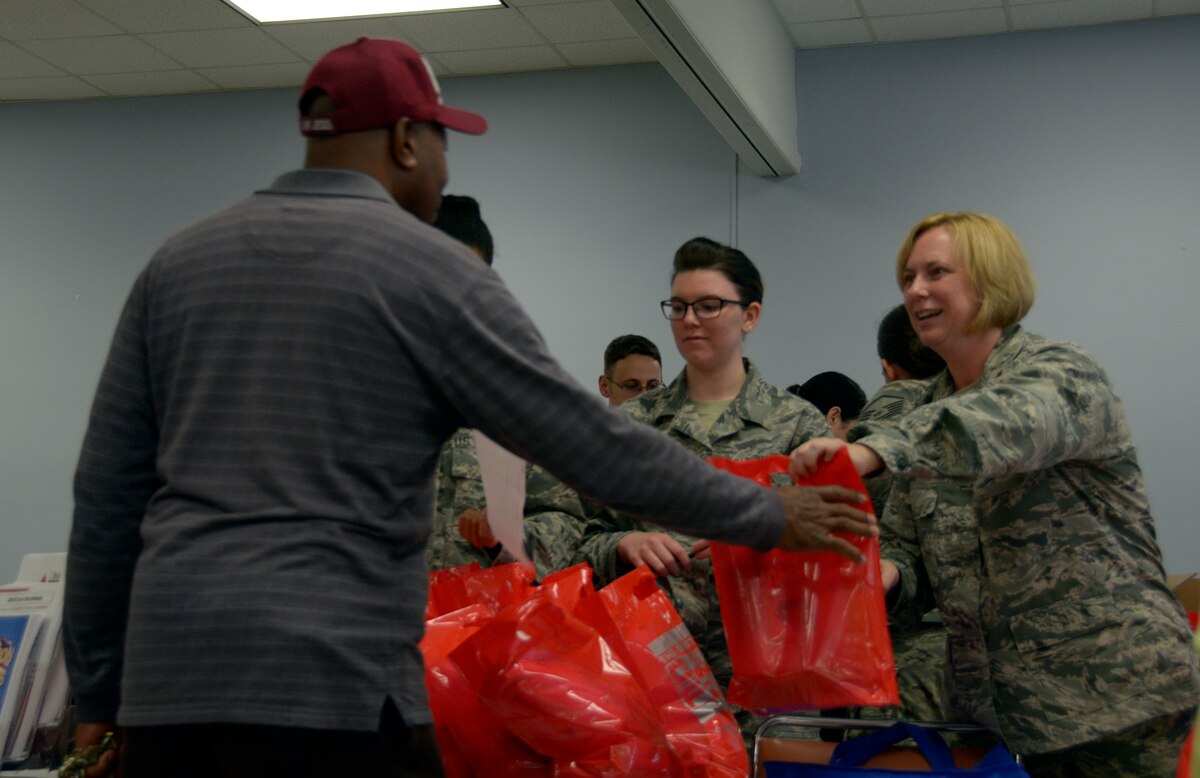 DAYTON, Ohio -- Volunteers from the 445th Airlift Wing bag and hand out donated items at the Dayton Veterans Affairs Medical Center Homeless Vets Stand down event Sept. 30, 2016. The annual event provides a meal, clothing, health screenings, VA and Social Security benefits counseling, and referrals to a variety of other necessary services, such as: housing, employment, substance abuse and mental health treatment services to more than 300 veterans. (U.S. Air Force photo/Staff Sgt. Joel McCullough)