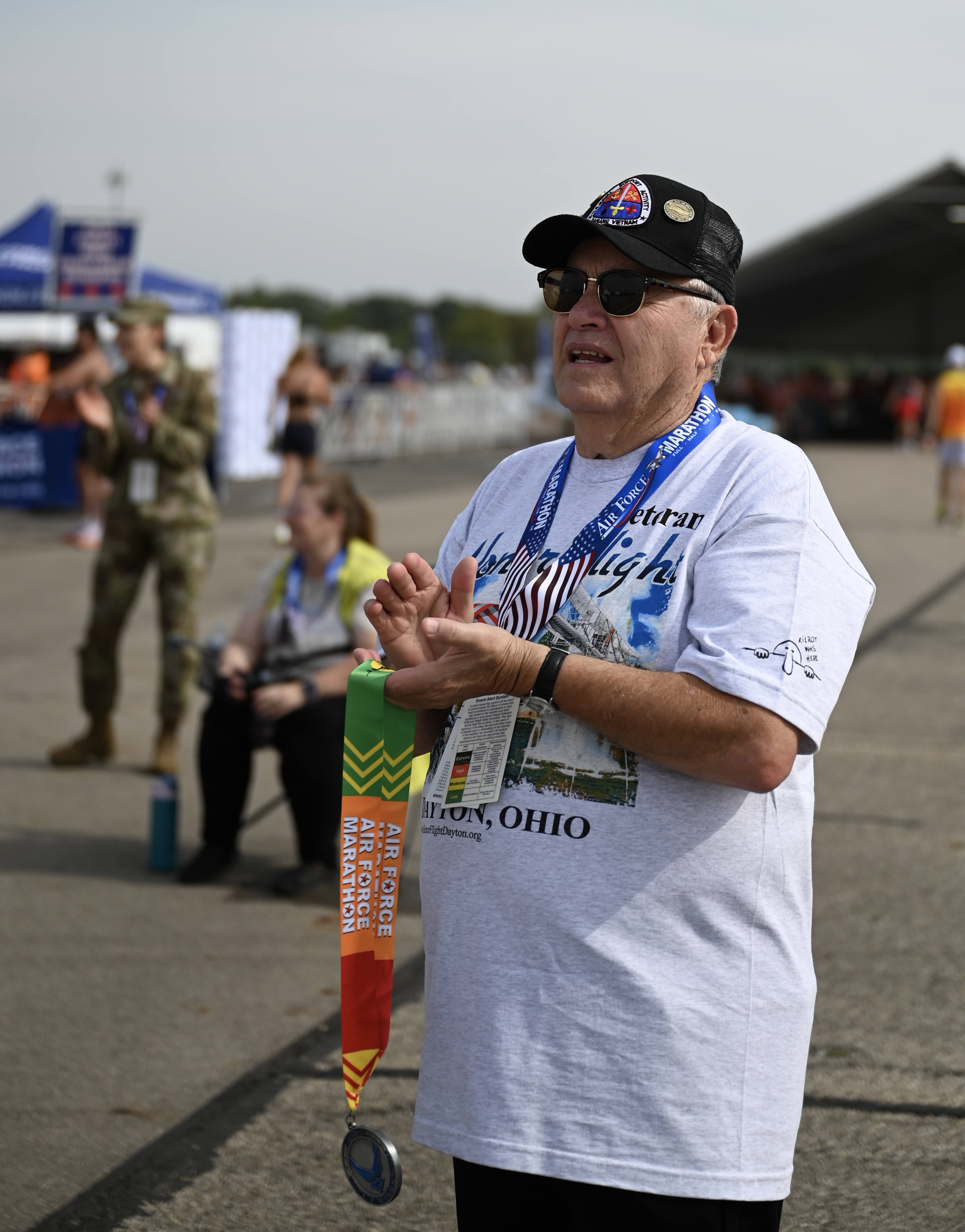 Vietnam veteran Bob Downey cheers for runners in the Air Force Marathon at Wright-Patterson Air Force Base, Ohio, Sept. 20, 2025. As part of Operation Honor 2025, veterans were on hand to cheer on runners and present medals to winners while also engaging with younger generations of service members before tomorrow's historic Honor Flight on an Air Force Reserve C-17 Globemaster III assigned to the 445th Airlift Wing. (U.S. Air Force photo by Staff Sgt. Johnathan QuiƱones)